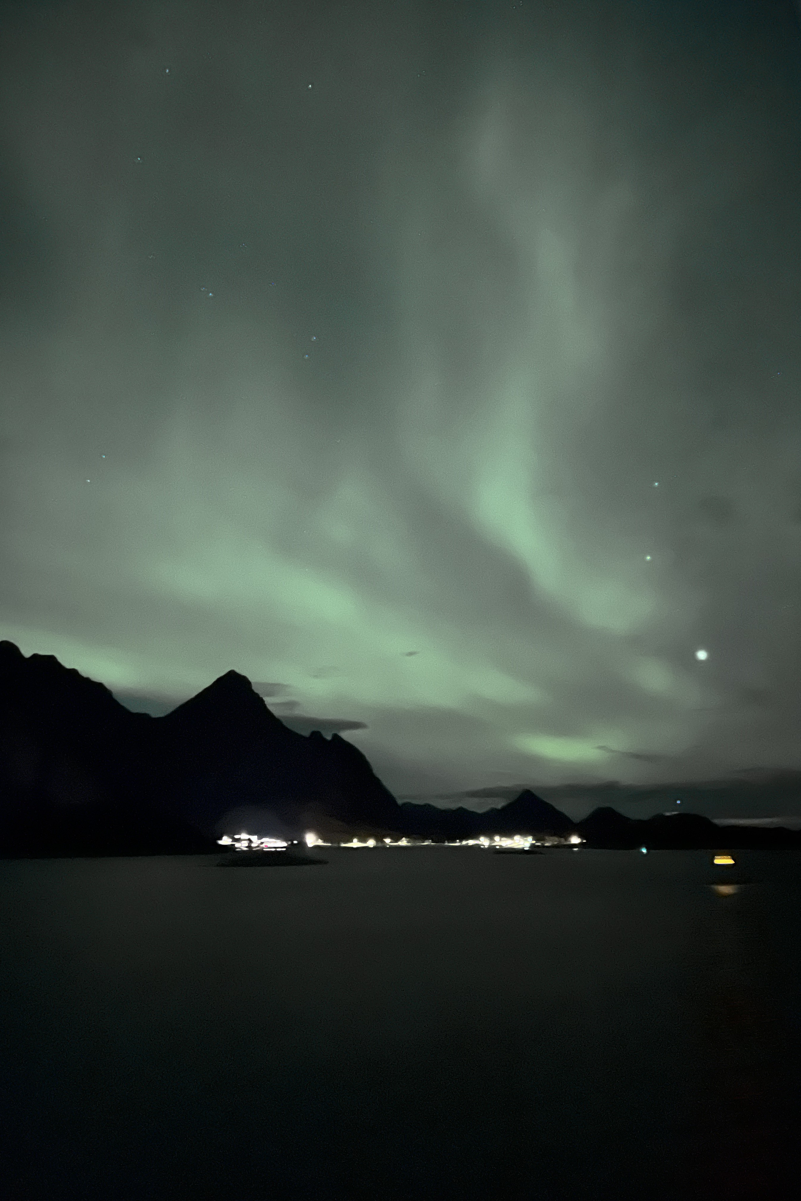But before we even set sail, the magic began. Before we left the dock in Bergen at 8:30 PM, we received a notification that someone had spotted the Northern Lights. We rushed to the observation deck and got our very first pictures of the auroras stretching above Bergen—a bucket list item checked off before we even picked up our Astronomer, who joined us at the first port!